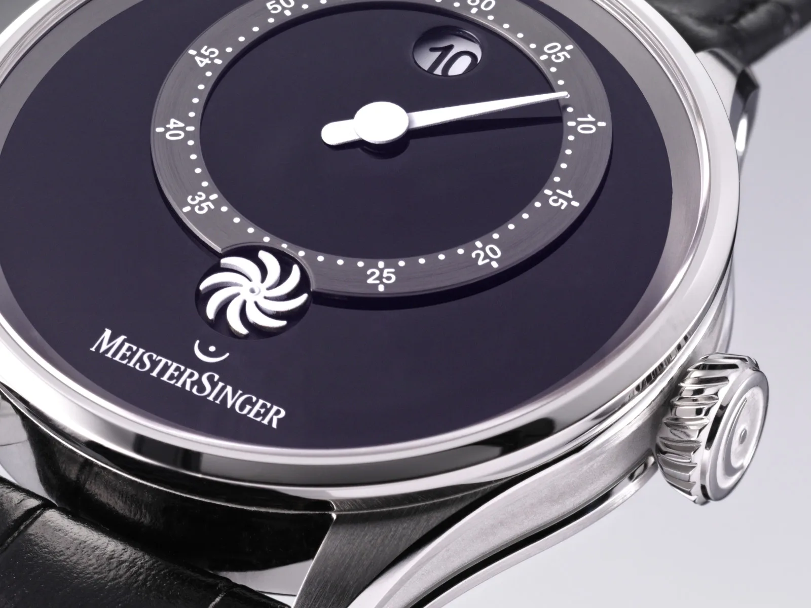 この“サンホイール”は時間を計測するわけでも、カウントするわけでもありません。しかし、絶え間なく流れる時間の存在を可視化し、内部のムーブメントが休むことなく作動していることを静かに伝えます。瞑想的ともいえるこの動きが、時計に生命感を吹き込み、MeisterSingerの世界観に新たなアクセントを加えています。
