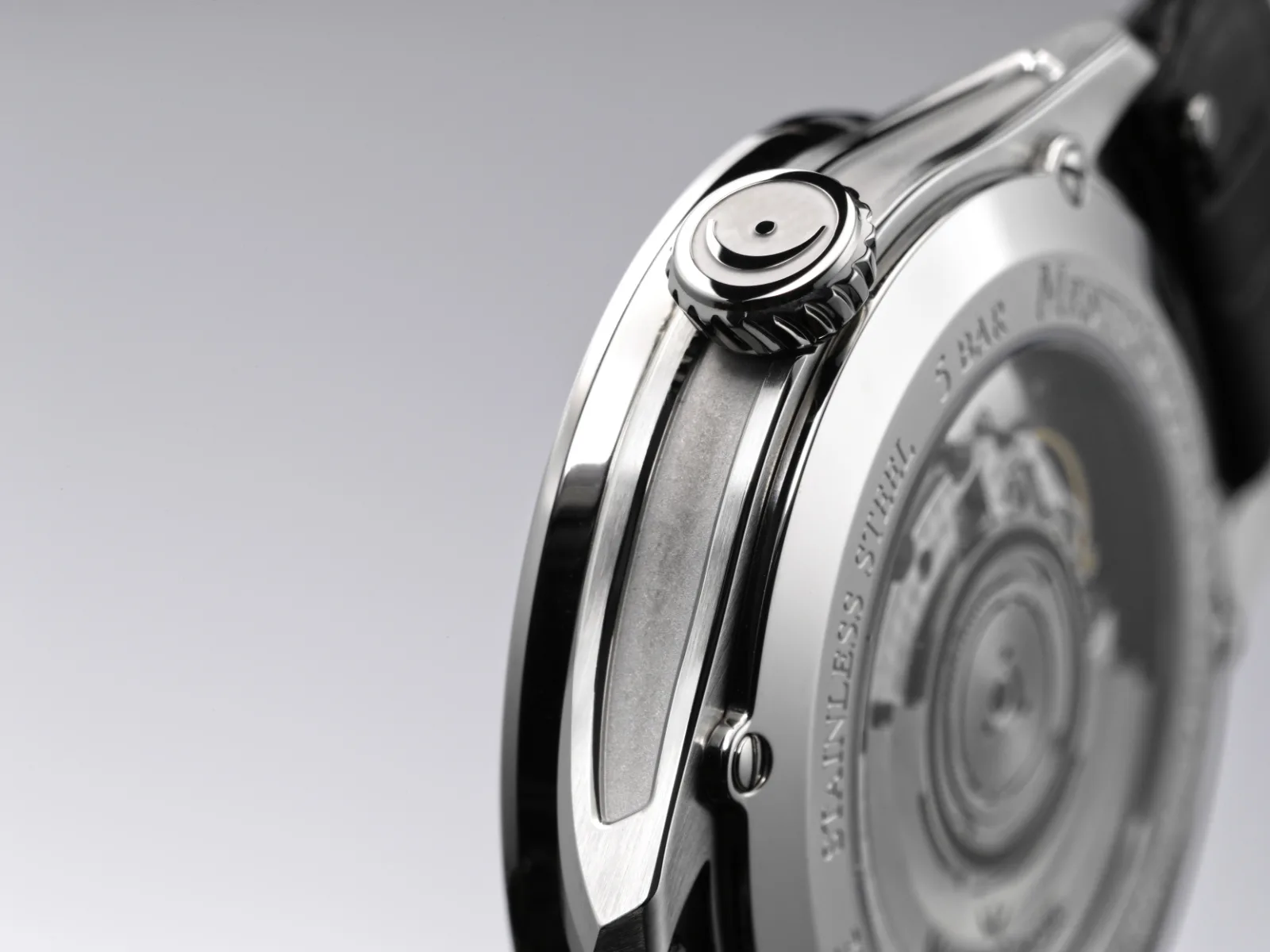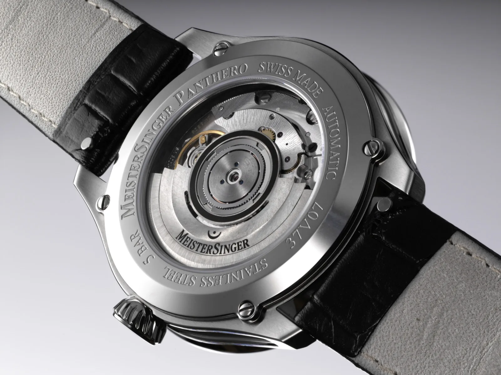 さらに、MeisterSingerの象徴的なディテールも健在です。わずかにドームを描くサファイアクリスタル風防と、ムーブメントの精緻な動きを堪能できるシースルーバックが備えられています。
